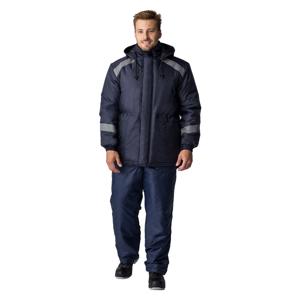 Куртка, утепленная прямого силуэта с центральной застежкой на тесьму молнию. Куртка с ветрозащитной планкой с застежкой на четыре «ленты контакт». Куртка со съёмным утеплённым капюшоном, который пристегивается к куртке при помощи четырех петель и пуговиц. Капюшон регулируется по лицевому вырезу за счет шнура. На талии расположена кулиска для регулировки объема. Внизу куртки расположены накладные карманы с наклонным входом. На левую полочку подкладки настрочен нагрудный накладной карман Низ спинки с удлинённым фигурным низом: дополнительная защита от холода. Куртка со светоотражающими полосами на кокетке, в верхней части спинки и рукавах, ширина ленты СОП 50 мм. Рукава втачные с манжетой на эластичной тесьме. Воротник у куртки втачной «стойка».