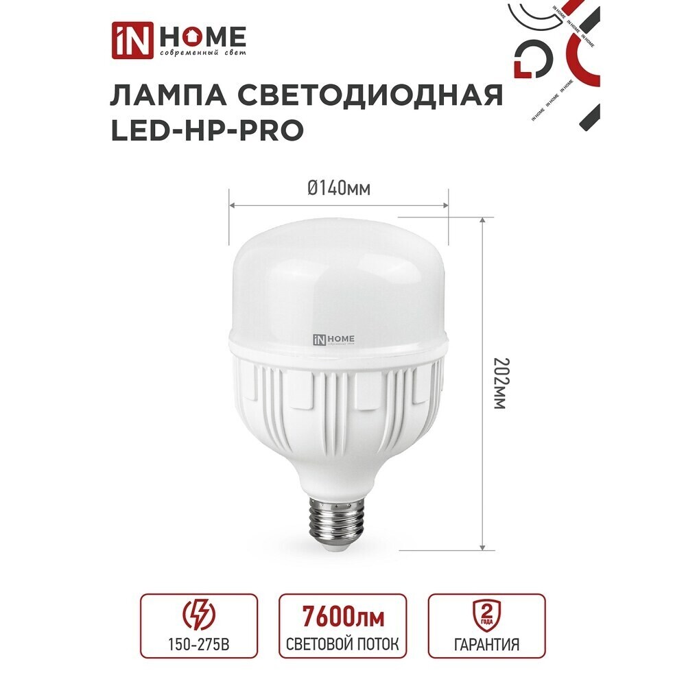 Лампа светодиодная IN HOME Е27/Е40 6500К 80 Вт 7600 Лм 230 В цилиндр T120 матовая
