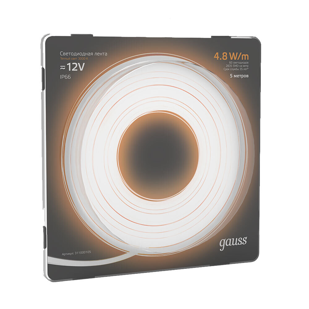 Лента светодиодная SMD 2835 Gauss 3000К 12 В 4,8 Вт/м 5 м IP66 (311000105)