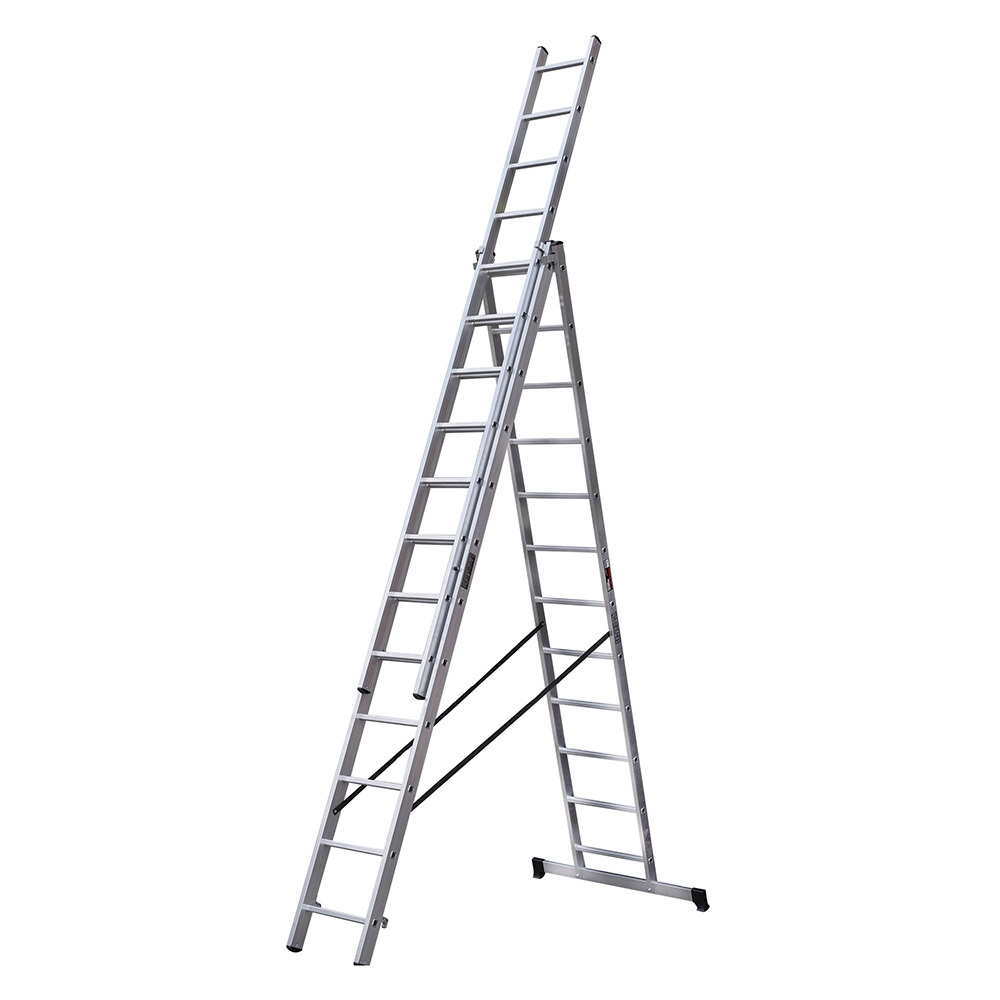 Предназначена для бытового использования. Лестница 3-секционная, в каждой секции 12 ступеней. Может быть использована как приставная лестница, раздвижная лестница, стремянка, стремянка с выдвижной секцией. Имеет дополнительную функцию «лестничный марш» (установка на разноуровневой поверхности). Стойки и перекладины изготовлены из алюминиевого профиля. Рифленые перекладины имеют размер 23х23 мм для надежного сцепления. Вальцовочное крепление перекладин по прочности не уступает сварке, а широкая опорная траверса стабилизирует конструкцию. Лестница оснащена двумя зацепами и автоматическим фиксатором секции на нужном шаге. Кронштейны соединяют и направляют секции, а алюминиевая стяжка создает жесткую конструкцию и фиксирует рабочее положение. Страховочные погодоустойчивые ремни на заклепках с увеличенной шляпкой создают жесткую конструкцию, не гниют и не выгорают. Башмаки траверсы из прочного пластика не скользят и не повреждают поверхность. Лестница компактно складывается для хранения и транспортировки, в сложенном состоянии занимает мало места.