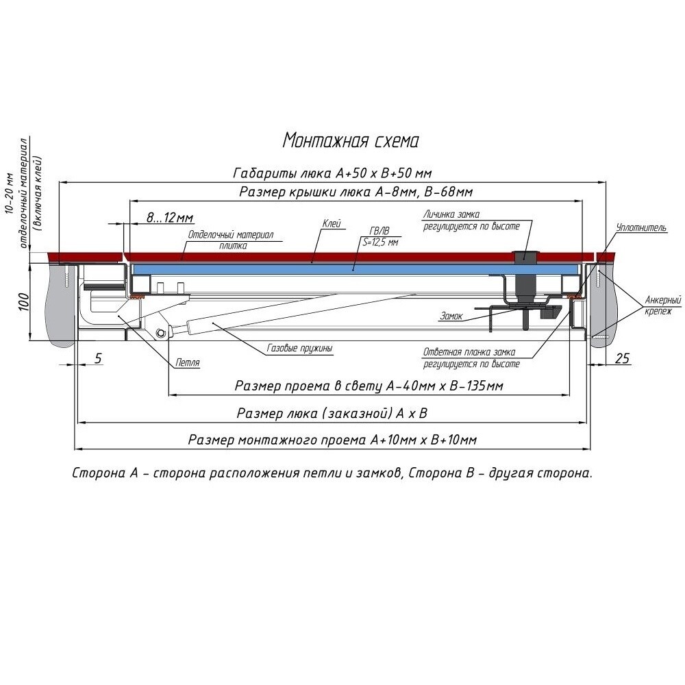 Люк предназначен для доступа к коммуникациям, проходящим в полу (сантехническим, электрическим, телекоммуникационным). Изделие окрашено порошковой краской с 20%-м содержанием цинка, это дает устойчивость к коррозии. Наличие резиновых уплотнителей делает люк влаго-, пыле-, шумо-стойким. Металлический профиль с дополнительными ребрами жесткости, обеспечивает высокую прочность люка. Он обеспечивает безупречный внешний вид и позволяет инсталлировать любое напольное покрытие – керамическую плитку, керамогранит, камень, паркет, линолеум.