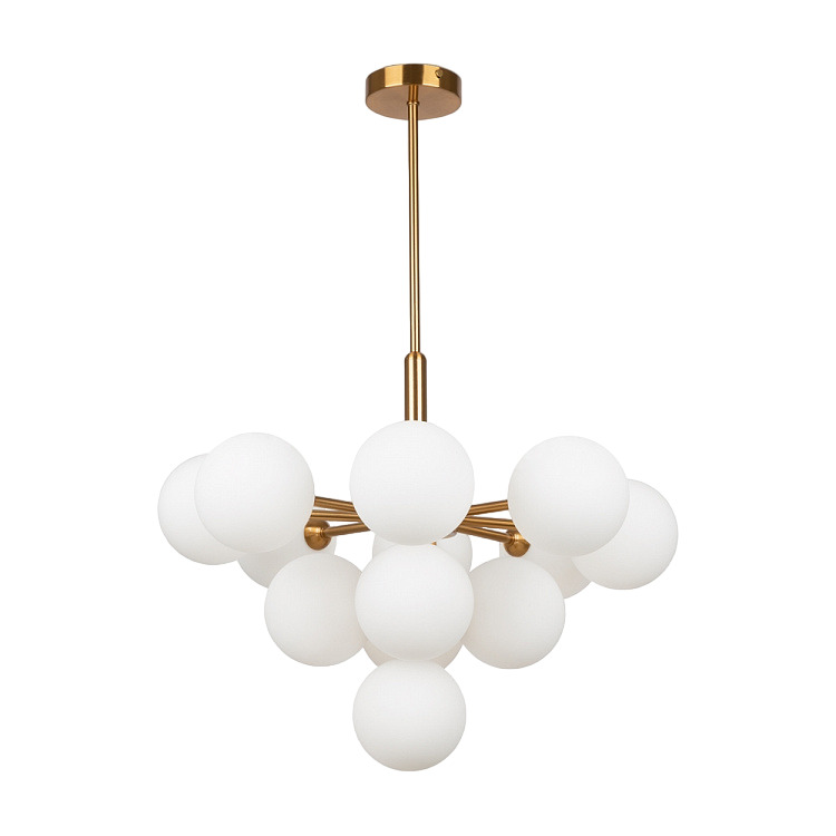 Предназначена для освещения помещения. Металлическая арматура светильника выполнена в актуальном оттенке латуни. Аскетичный силуэт подчеркнут шаровидными плафонами из матового белого стекла. Серия, объединившая эстетику и лаконичный минимализм, включает люстру на 13 плафонов, бра и настольную лампу. Ассортимент подходит для общей и зональной подсветки, а при желании – легко комбинируется с любыми моделями, оснащенными сферическими плафонами. Элегантные светильники дополнят пространство спальни, гостиной или кабинета.