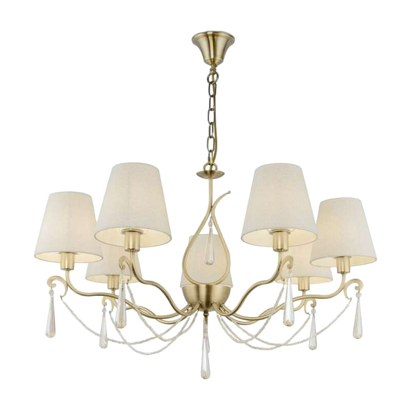 Предназначена для освещения внутренних помещений. Арматура светильника выполнена из металла цвета античной латуни. Красота подчеркнута изящным изгибом рожков и декором из хрусталя каплевидной формы. Тканевые абажуры с фактурной поверхностью добавляют композиции особый шарм и обеспечивают мягкий поток света. Высоту подвесных светильников можно регулировать, учитывая размеры помещения. Серия из трех люстр на 12, 7 и 5 плафонов, подвеса, бра, настольной лампы и торшера – готовый ансамбль для подсветки интерьеров в стиле классика, неоклассика, ар-деко, модерн.