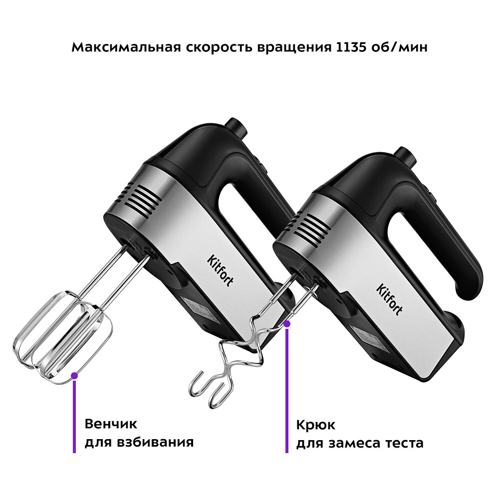 Kitfort КТ-3409 — ручной миксер, который поможет смешать ингредиенты, взбить яичный белок, приготовить соус, замесить тесто. Прибор оснащен двумя комплектами насадок: венчики для взбивания ингредиентов, а крюки подойдут для замеса более плотного теста. Миксер оснащен 5 скоростями работы и турборежимом. Регулятор скорости и кнопка турборежима расположены на ручке миксера, поэтому переключить скорость во время работы будет легко и удобно, готовьте любимые блюда с удовольствием. Мерная емкость-подставка миксера КТ-3409 поможет отмерить нужное количество ингредиентов, а также на нее можно ставить устройство во время перерыва, а для удобного хранения в нее помещаются все насадки. Миксер КТ-3409 прост в управлении: установите подходящую пару насадок, выберите нужную скорость с помощью регулятора и приступайте к приготовлению любимых блюд.