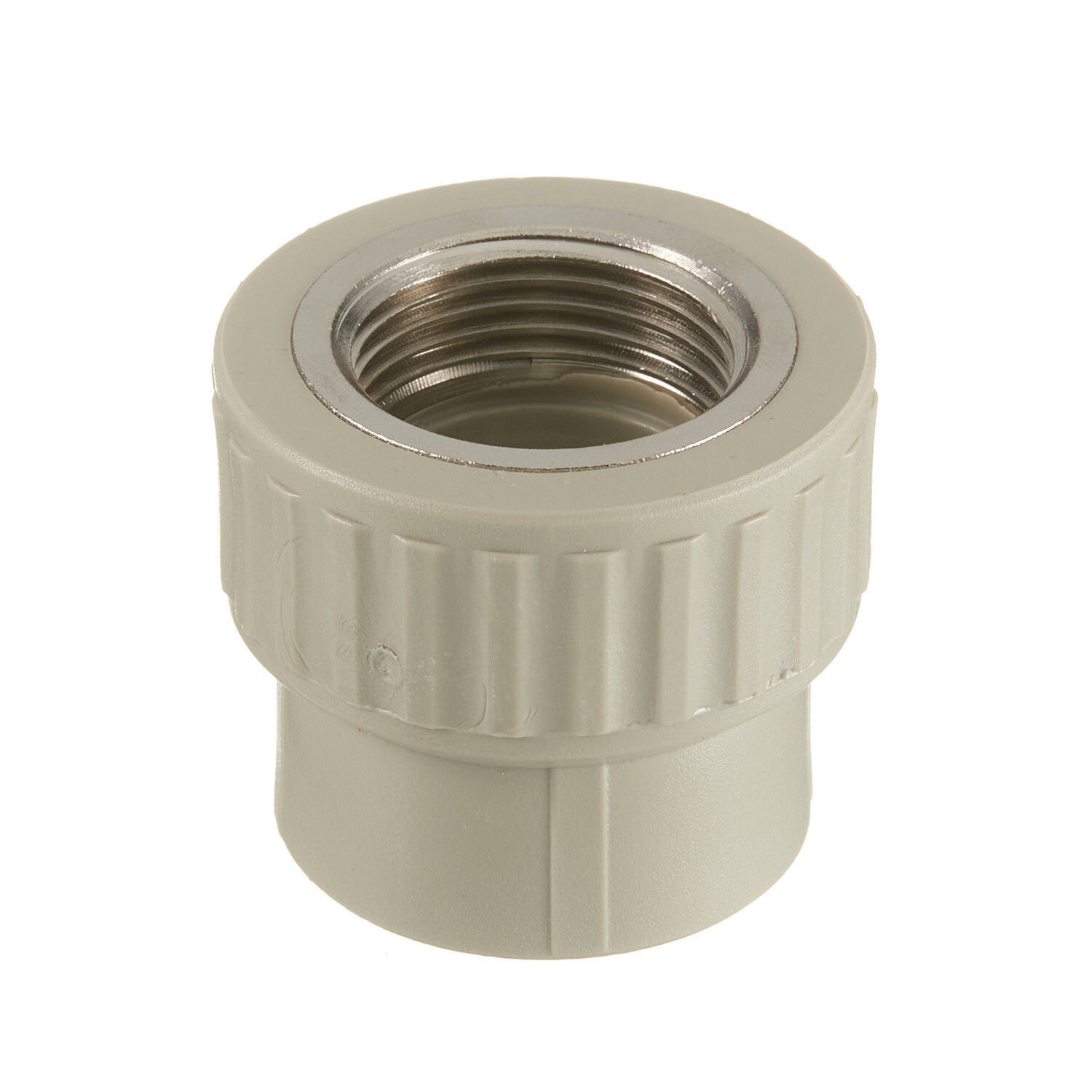 Муфта полипропиленовая, закладная деталь которой изготовлена из латуни марки ЛС-59-1. Используется для соединения полипропиленовой трубы и элемента системы с резьбовым соединением. Латунные части производятся методом горячего штампования, пластиковые — методом литья под давлением.
