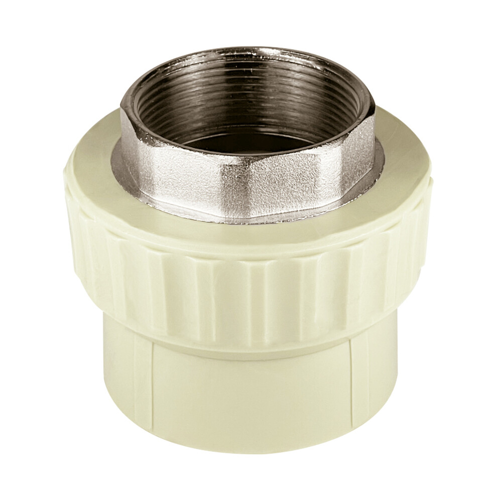 Муфта полипропиленовая, закладная деталь которой изготовлена из латуни марки ЛС-59-1. Представляет собой разъемное соединение между металлической и пластиковой трубой. Латунные части производятся методом горячего штампования, пластиковые — методом литья под давлением.