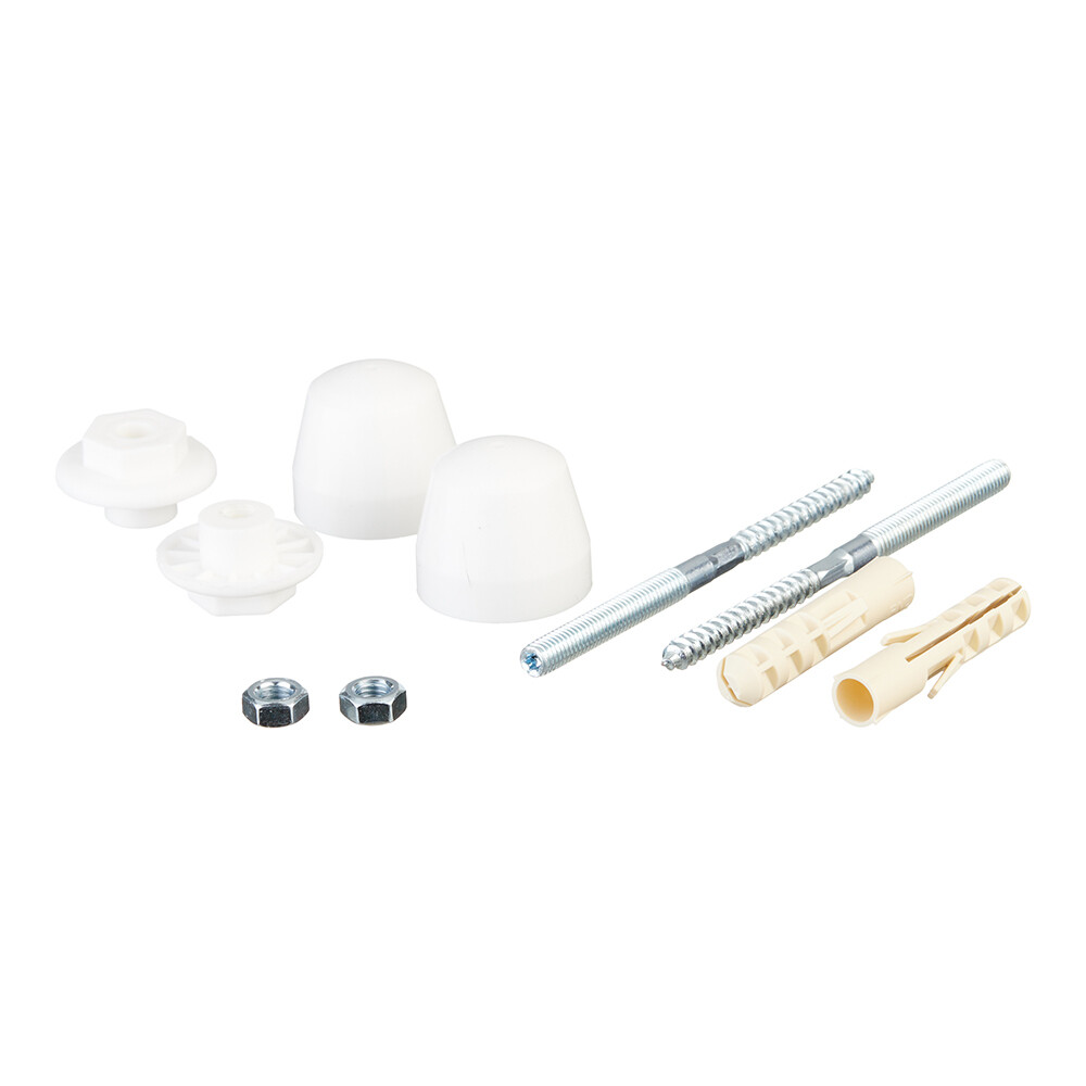 Состав: Шпилька сантехническая М8х120 — 2 шт; Дюбель нейлоновый распорный 12х60 — 2 шт; Гайка оц. DIN 934 М 8 — 2 шт; Шайба пластиковая — 2 шт; Колпачок пластиковый — 2 шт.