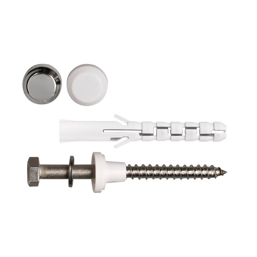 Состав комплекта: Дюбель распорный нейлоновый 8×65 мм — 2 шт.; Шуруп из нержавеющей стали 6х80 мм — 2 шт.; Шайба из нержавеющей стали — 2 шт.; Втулка, полиэтилен — 2 шт.; Заглушка D 17,5 мм белая/хром, полиэтилен — 2 шт.