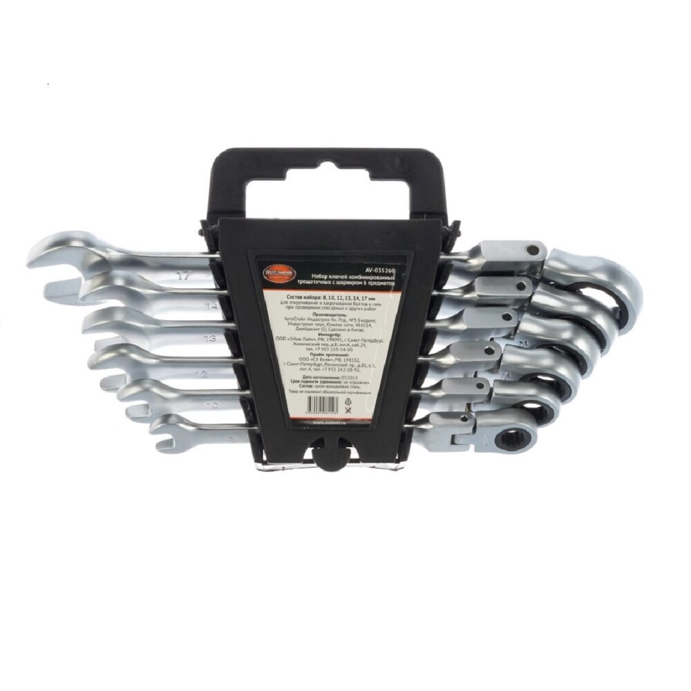 Набор комбинированных трещоточных ключей AV Steel AV-035260 с шарниром, 6 предметов, представлен в оптимальной комплектации и содержит популярный размерный ряд. Cr-V сталь обладает прочностью и стойкостью к высоким нагрузкам. Хромоникелевое покрытие обеспечивает надежную защиту от коррозии и значительно продлевает срок службы инструмента.