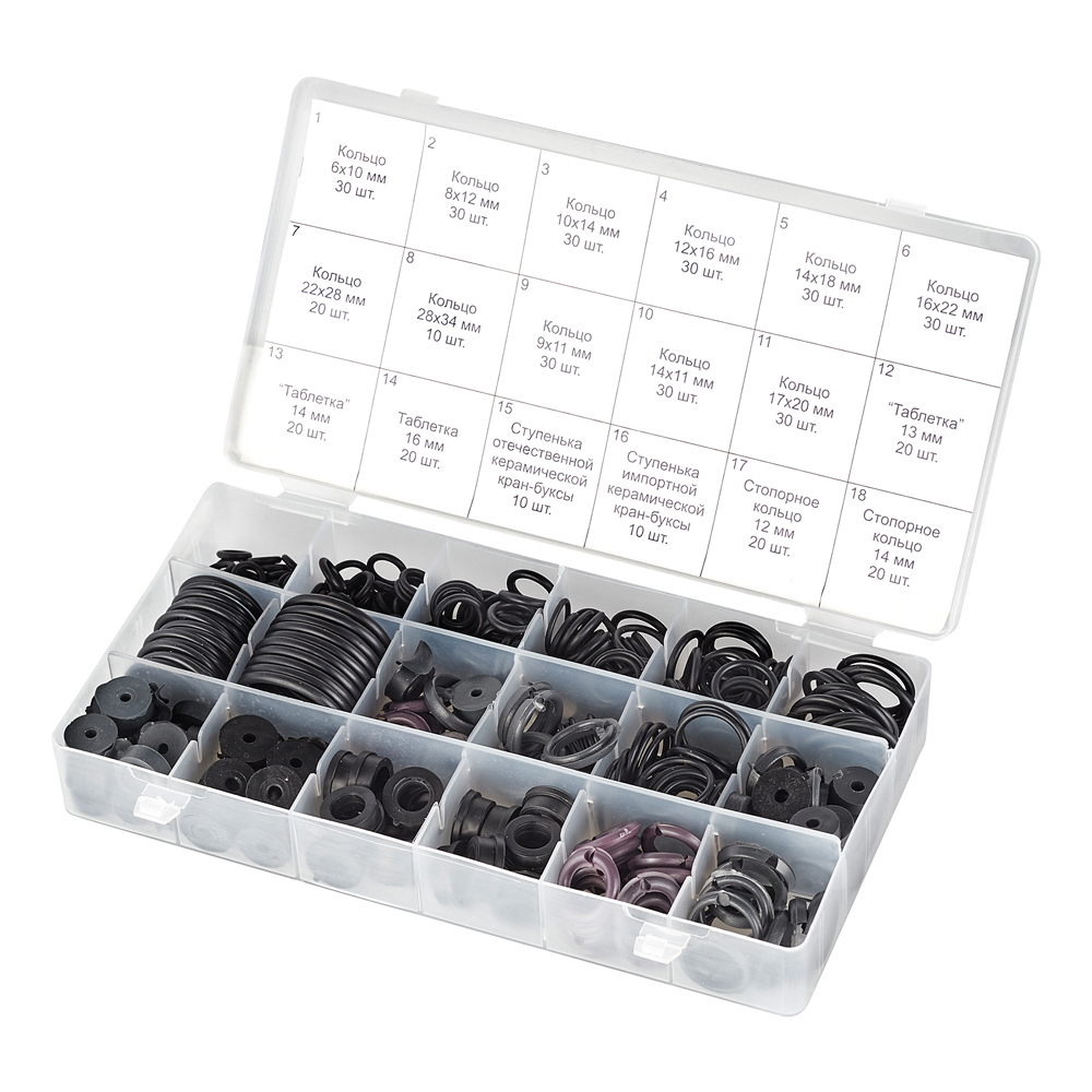 Предназначен для смесителя и бытовой сантехники. В комплект входит 405 прокладок 18 видов. Набор упакован в специальный прозрачный пластиковый кейс с разделителями, благодаря чему прокладки удобной переносить и хранить.