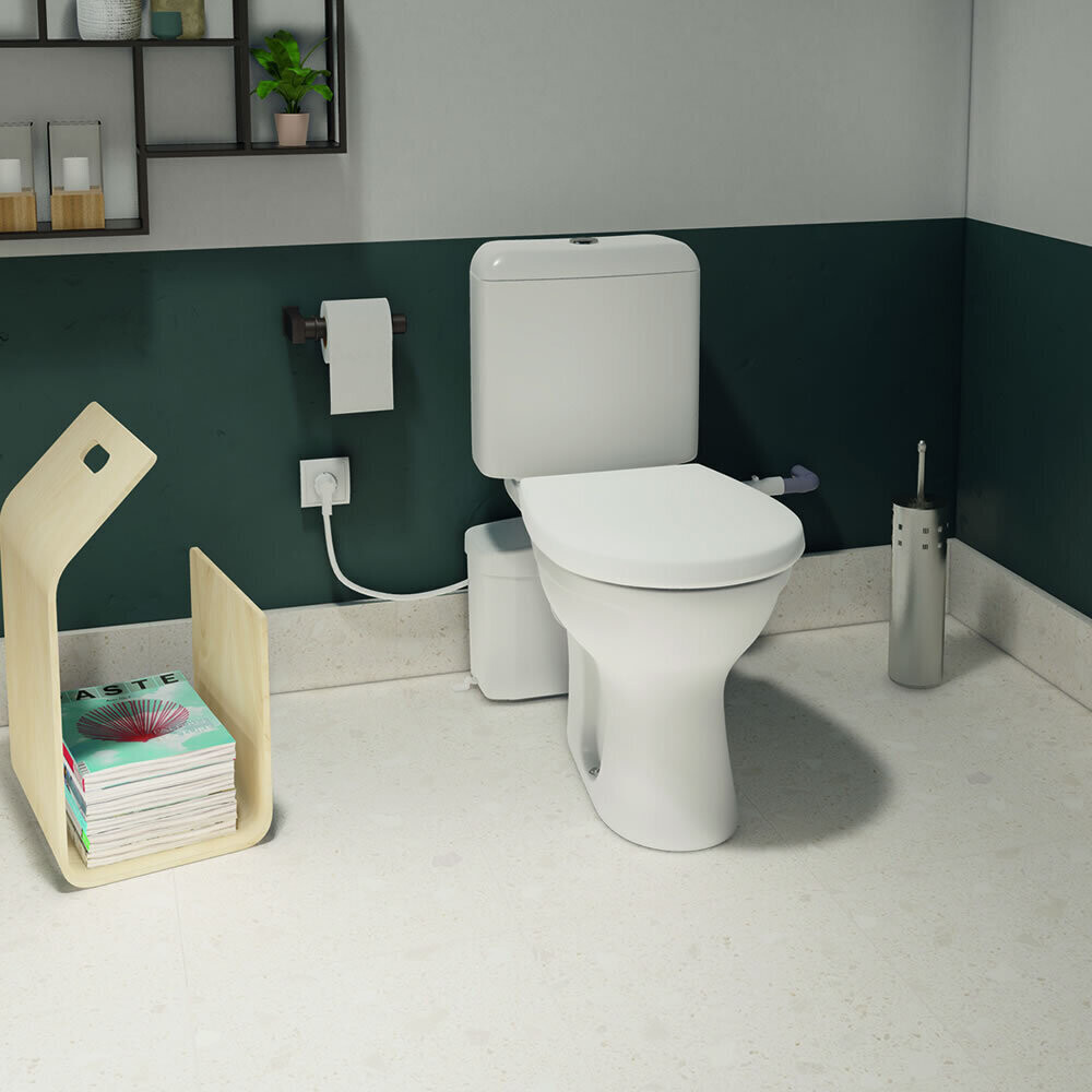Канализационный насос Sanibroyeur, предназначенный для измельчения и отведения фекальных стоков от унитаза с горизонтальным выходом.