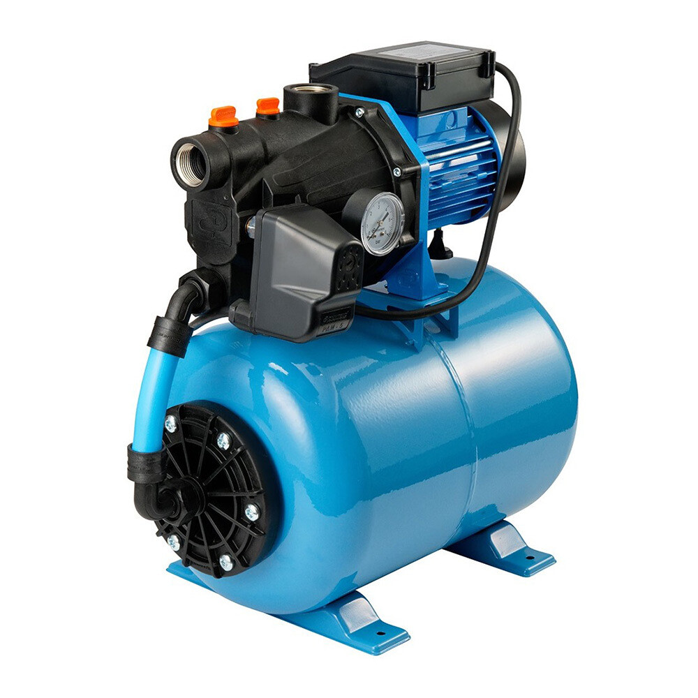 Насосная станция Джамбо 60/35 П-24 – автоматическая водоподъемная установка на основе самовсасывающего электронасоса. Насосная станция укомплектована поверхностным самовсасывающим электронасосом, горизонтальным гидроаккумулятором емкостью 24 литра, реле давления, манометром, соединительной арматурой и электрошнуром с вилкой. Насос состоит из двух основных частей — насосной части и электродвигателя, которые крепятся на переходном фланце. Корпус насоса выполнен из стеклонаполненного полипропилена с закладными резьбовыми деталями из латуни, а рабочее колесо и проточный блок — из износостойких пластических материалов. Алюминиевый переходной фланец со стороны насосной части отделен от контакта с водой пластмассовой крышкой. Графито-керамические торцевые самовсасывающиеся уплотнения предотвращают возможность внешней утечки из насосной части. Асинхронный короткозамкнутый электродвигатель включает в себя статор, подшипниковые щиты, короткозамкнутый ротор и коробку выводов. Статор электродвигателя защищен термопротектором и охлаждается вентилятором.