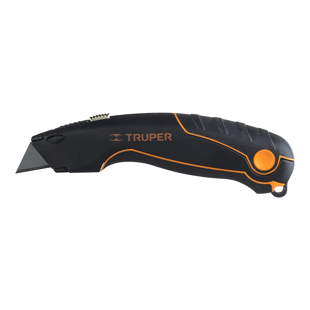 Безопасный универсальный нож Truper с трапециевидным лезвием из стали SK-2, 4 лезвия в комплекте, удобный отсек для хранения лезвий. Легкий алюминиевый корпус с резиновыми вставками против скольжения. Удобная система смены лезвий.