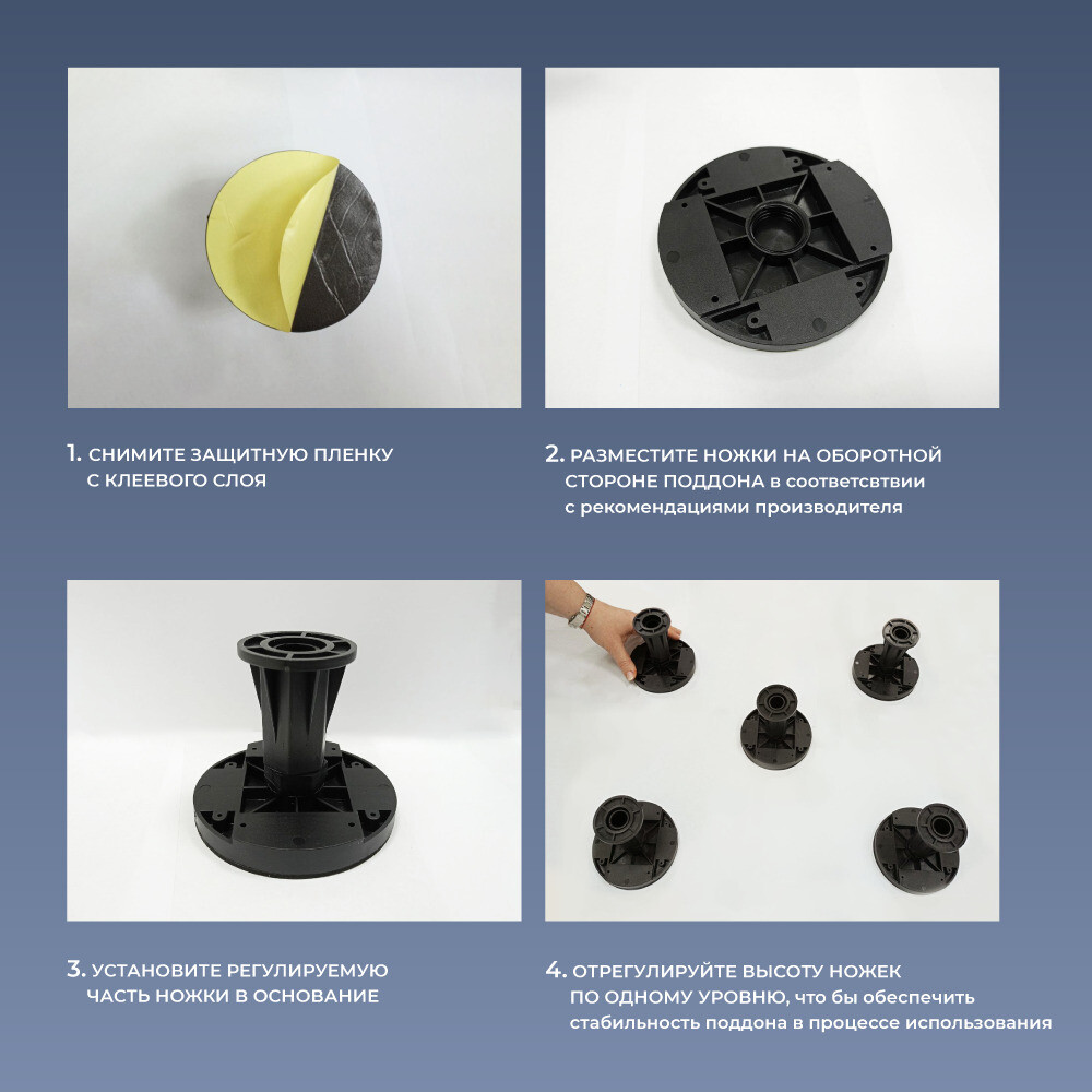 Ножки для поддона – это универсальное решение для монтажа душевых поддонов из искусственного камня и литьевого мрамора. Также, они подходят в качестве опорной конструкции для мебели – шкафов, тумб, стеллажей для хранения и т.д. Каждая ножка рассчитана на весовую нагрузку более 200 кг и оснащена усиленной клеевой основой, что позволяет легко и быстро произвести монтаж. Диаметр опор обеспечивает стабильную устойчивость, при корректном размещении ножек в соответствии с геометрией предмета, устанавливаемого на них.