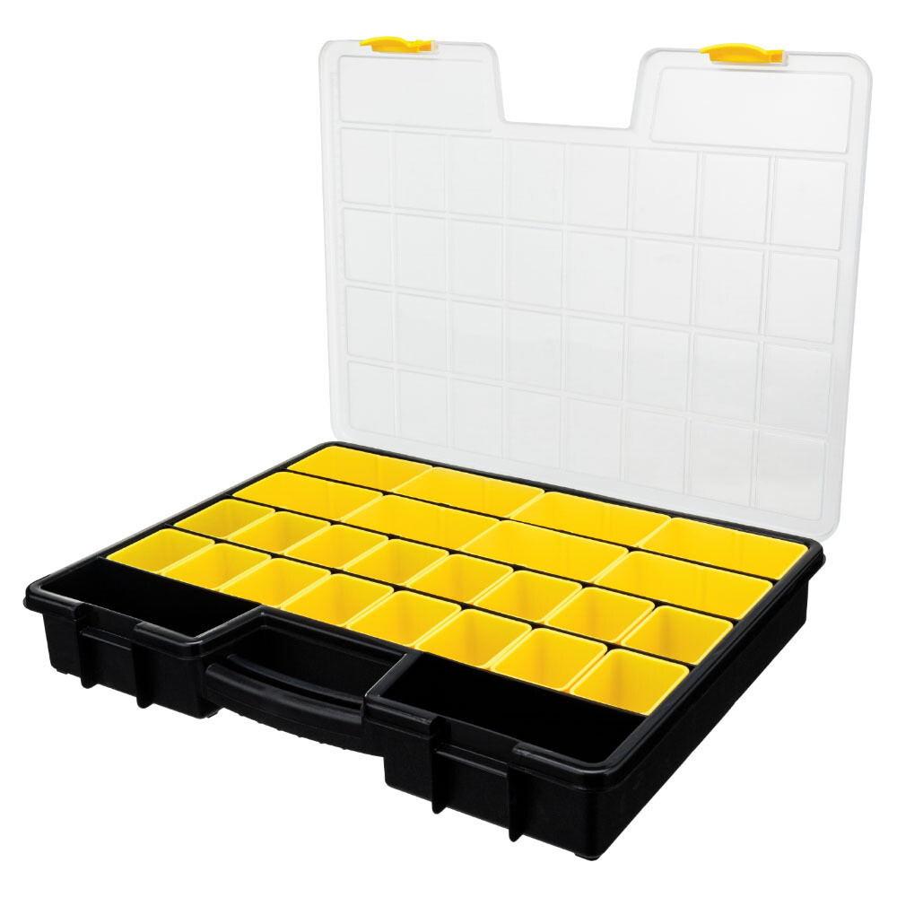 Органайзер «Worker Pro» поможет рассортировать крепежные и другие материалы: саморезы, гвозди, дюбели, болты, винты и пр. Внутри органайзера – съемные отделения в виде лотков, которые позволяют брать часть расходников и/или мелкого инструмента прямо к месту работы. Прочные замки не позволят органайзеру раскрыться и просыпать содержимое. Благодаря цельной округлой ручке органайзер удобно переносить или снимать с полки. Прозрачная крышка позволяет отслеживать запасы необходимых материалов и пополнять их при необходимости, а также удерживает отсеки для хранения на месте, предотвращая перемешивание содержимого. Изготавливается из 100% перерабатываемого прочного безопасного полипропилена, не боится влажности и перепадов температур, легко моется.