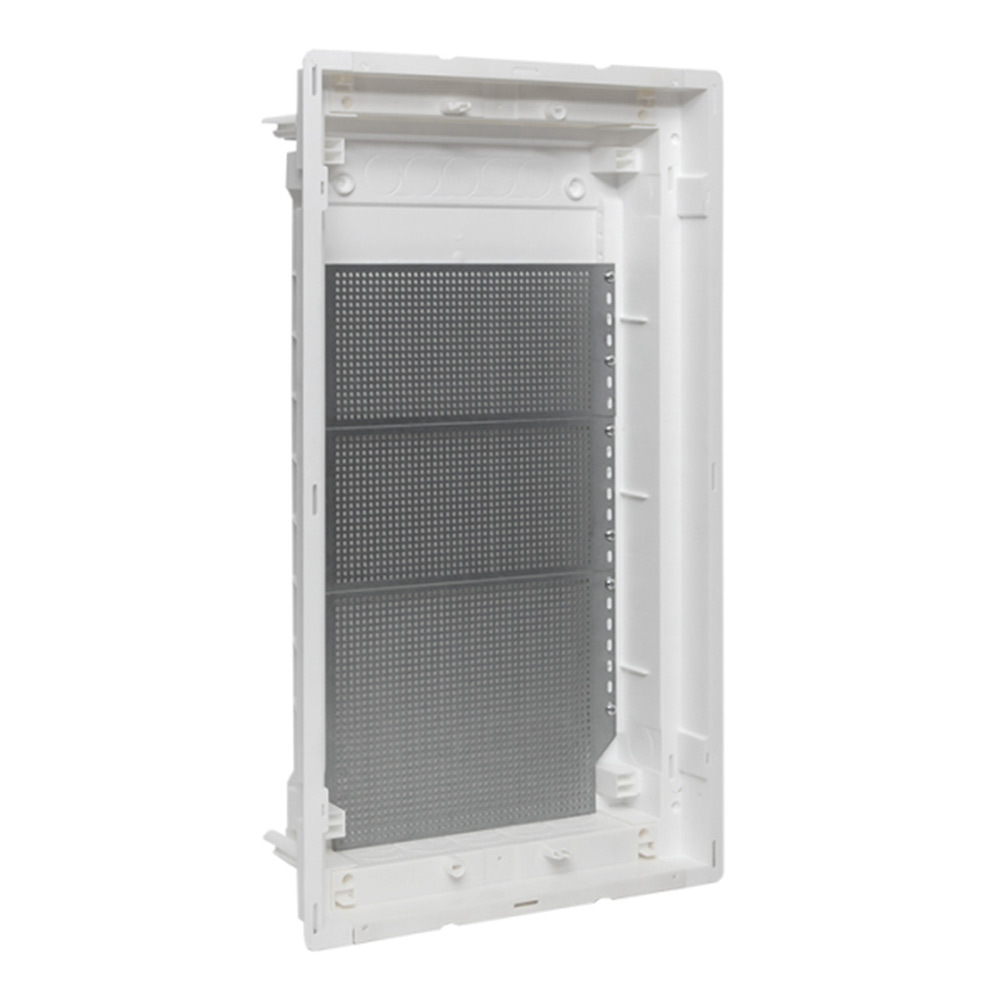 Предназначено для сборки силовых, слаботочных и комбинированных щитов. На DIN-рейки устанавливается модульное оборудование. На монтажные платы – антенные разветвители, Wi-Fi роутеры, патч-панели и иное слаботочное оборудование. Щиты устанавливаются как в бетонные и кирпичные стены, так и в гипсокартон, монтажные комплекты для установки в гипсокартон входят в комплектацию оснований щитов либо в комплектацию щитов в сборе. Двери щитов можно выбрать из разных материалов – пластик, металл или металл с перфорацией. Также доступны дополнительные аксессуары, необходимые для установки мультимедийного оборудования и существенно упрощающих монтаж щитов. Есть возможность приобрести как отдельно основание щита и дверь, так и основание с дверью в комплекте в одной коробке. Основные преимущества — съемные шасси с din-рейками, съемные кабельные фланцы, гребенка для фиксации входящих проводников, регулировка дверей по глубине, современный минималистичный дизайн.