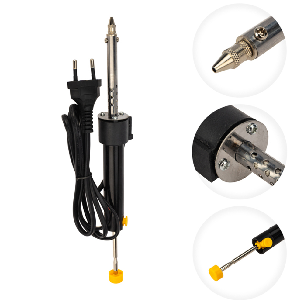 Паяльник с экстрактором припоя мощностью 40 Вт предназначен для ручного демонтажа электронных компонентов с печатных плат и удаления лишнего припоя. Подходит как для любительского, так и для профессионального использования. Устройство представляет собой паяльник, совмещенный с вакуумным насосом — наконечником для Втягивания расплавленного припоя с обрабатываемой поверхности. Принцип действия — нагретым паяльником разогревают припой, взводят вакуумный механизм, нажимают на спусковую кнопку фиксатора, после чего пружина выталкивает поршень, а перепад давления засасывает припой внутрь, освобождая детали на плате. Удобная рукоятка, выполненная из термостойкого пластика, сделает работу с инструментом легкой и приятной.
