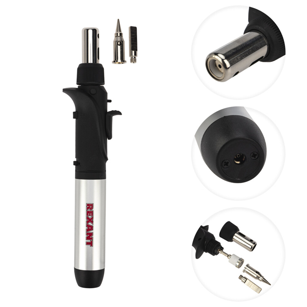 Паяльник газовый REXANT предназначен для ручного монтажа радиоэлементов, для плавки и сварки пластиковых частей, нагрева малых металлических элементов, плавки металла с низкой температурой плавления, ремонта ювелирных изделий, сгибания тонких стеклянных трубок, прогрева механизмов в холодное время года и т.п.