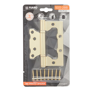 Универсальная дверная петля без врезки Fuaro 500-2BB/BL изготовлена из стали. Предназначена для установки на деревянные двери, подходит для дверей правого и левого открывания. Не требует врезки. Гальваническое покрытие прошло тест на устойчивость к коррозии в соляном тумане — более 96 часов, что соответствует высшему 4 классу стойкости покрытия. Края петель прошли дополнительную полировку. В петле 500-2BB/BL установлены два внутренних подшипника и стальной стержень, что обеспечивает 1 млн циклов открывания/закрывания. Благодаря двум опорным подшипникам, петля устойчива к проседанию. Максимальная нагрузка на 2 петли 35 кг, на 3 петли 45 кг. Размер петли: 100×2,5. Саморезы в комплекте.