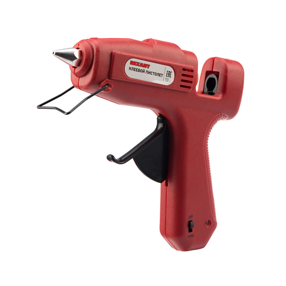 Пистолет клеевой Rexant (100 Вт, Ø11 мм) предназначен для прочной фиксации поверхностей с помощью расплавленной клеевой массы.