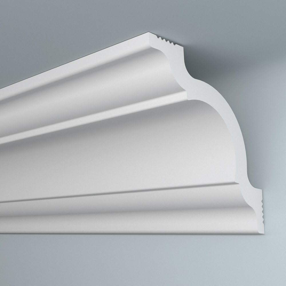 Предназначен для внутренней декоративной отделки жилых помещений. Классическая модель плинтуса имеет высокую плотность, гладкую матовую поверхность. Оптимальная плотность потолочного плинтуса обеспечивает однородность структуры, а незначительный вес создает дополнительные удобства при монтаже. Не требует обязательной окраски. Крепится к стене и потолку при помощи шпаклевки или жидких гвоздей.