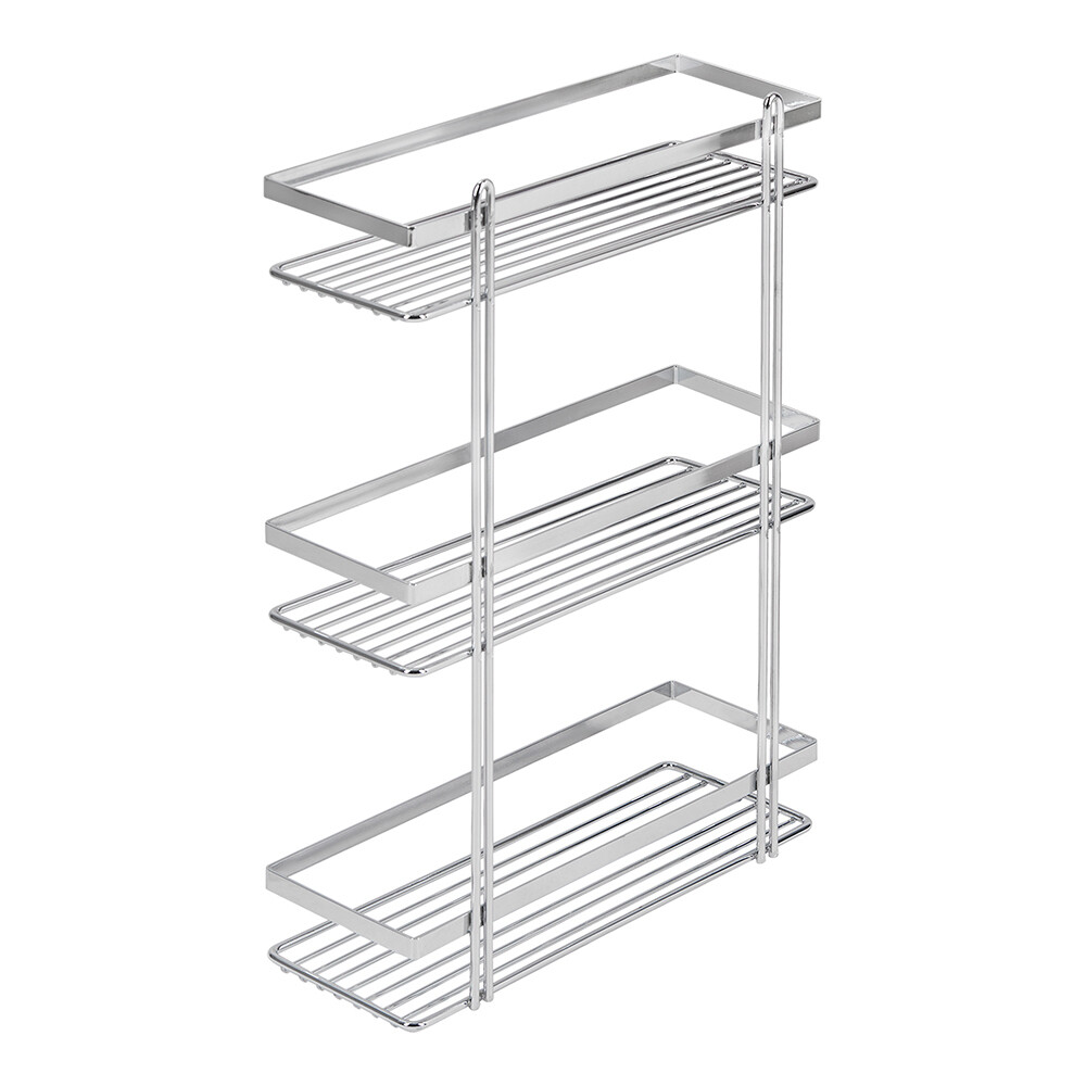 Полка прямая трехъярусная с плоским бортом, изготовлена из высококачественного металла с хромированным покрытием.