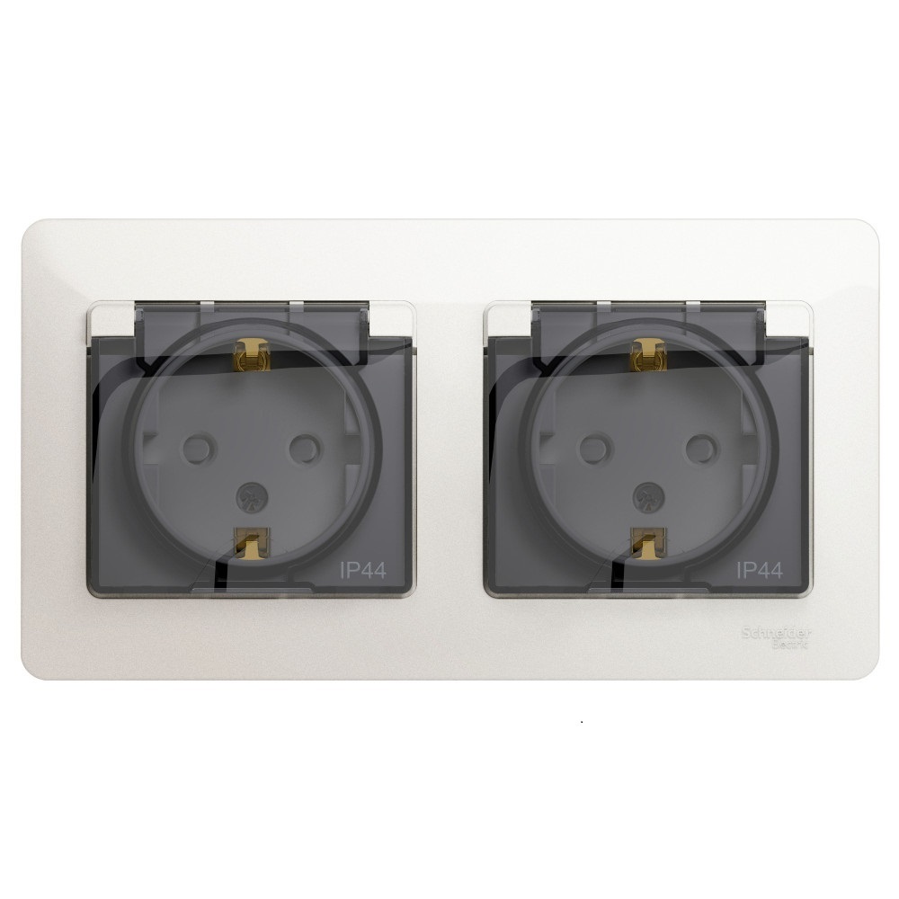 Розетка Systeme Electric (ранее Schneider Electric) серии Glossa (в сборе) двойная с заземлением, шторками и крышкой подходит для сетей 250 В, на ток 16 А.