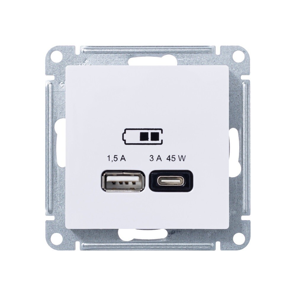 Розетка Systeme Electric (ранее Schneider Electric) серии AtlasDesign двойная USB с разъемами типа A+C высокоскоростная. Самая современная USB-зарядка с двумя разъемами позволяет заряжать как стандартные мобильные устройства через разъем типа А, так и новейшие устройства с разъемом типа С. Позволяет заряжать смартфоны последнего поколения, которые поддерживают функцию быстрой зарядки. Мощность: тип-A – 7.5 Вт, тип-С — 45Вт. Поддерживает современные протоколы быстрой зарядки QC, PD, последних версий. Лицевые детали из качественного ABS-пластика, устойчивого к царапинам и УФ-излучению.