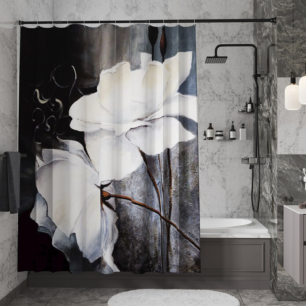 Комплектация: Шторка для ванной, пластиковые кольца — 12 шт.