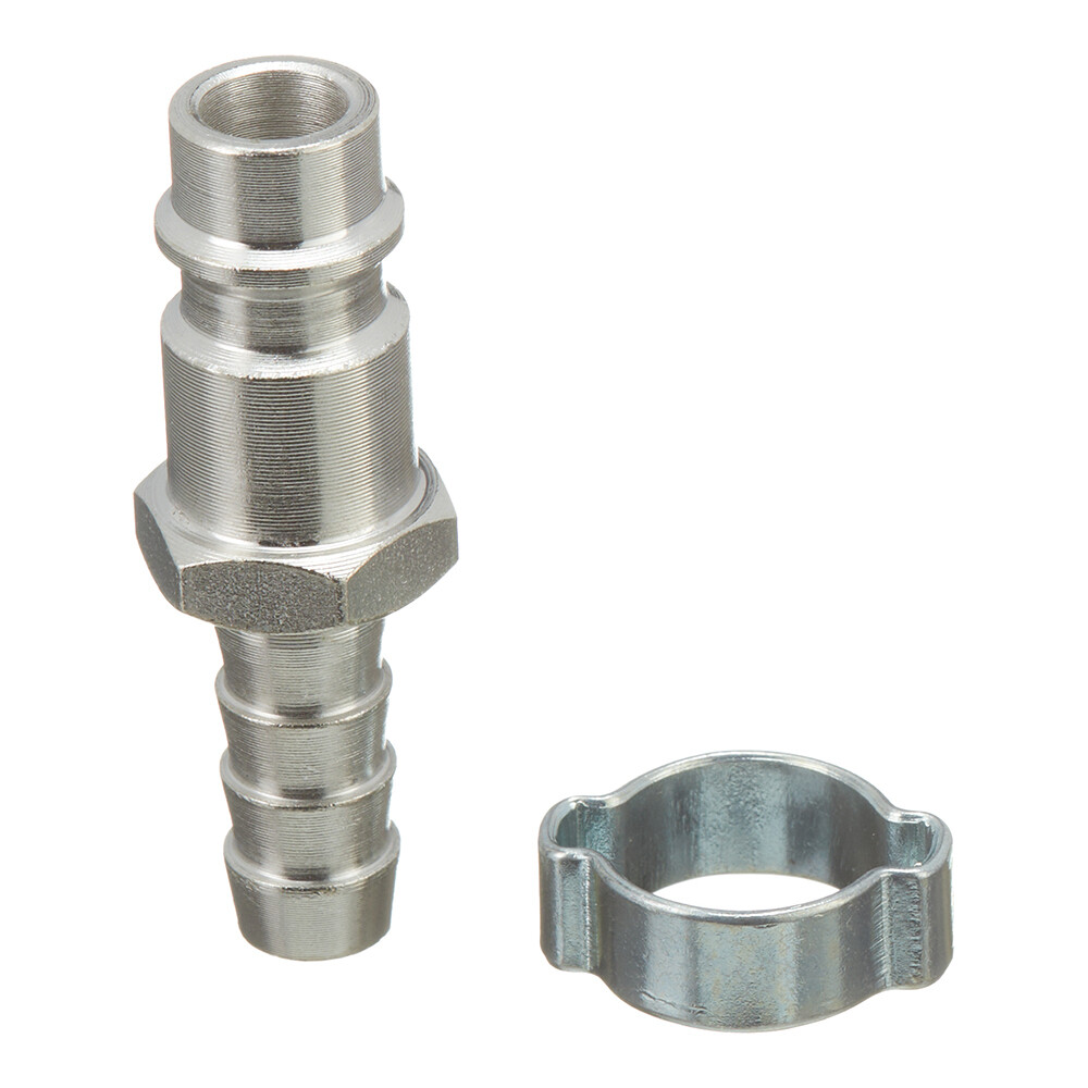 Переходник рапид-елочка для подключения компрессора к пневмоинструменту с помощью шланга. Диаметр шланга 8 мм. Крепление к инструменту – рапид, к шлангу – елочка. Обжимное кольцо 8×13 мм в комплекте. Поставляется в блистере.