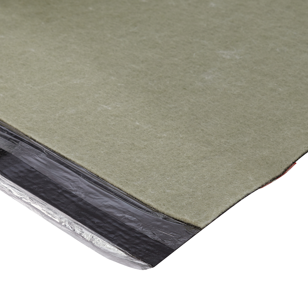 Состав: основа — стеклохолст, на обе поверхности которого нанесено битумно-полимерное вяжущее со слоем звукоизоляционного термоскрепленного полотна с одной стороны и металлизированной пленкой с другой стороны полотна.