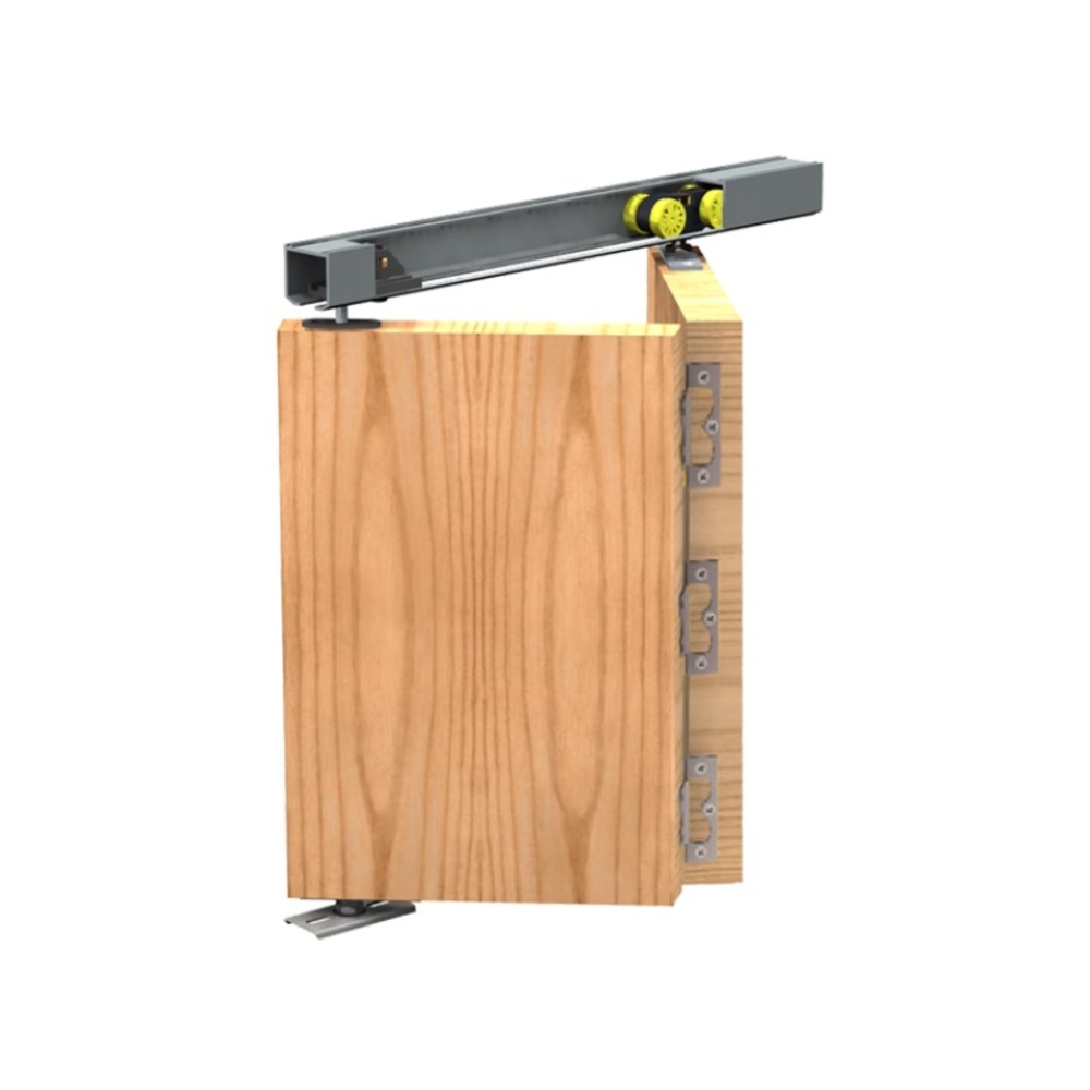 Данную систему можно использовать для монтажа двойной складной двери с шириной секции до 600 мм и весом каждой до 25 кг. Отсутствие нижней направляющей не портит эстетичный вид двери и всего помещения в целом.