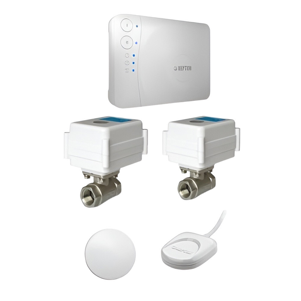Комплектация: Модуль управления Neptun Smart Tuya — 1 шт., кран с электроприводом МК 12 В 3/4 — 2 шт., датчик контроля протечки воды SW007 — 1 шт., радиодатчик Neptun Smart 868.2 — 1 шт., блок питания — 1 шт.