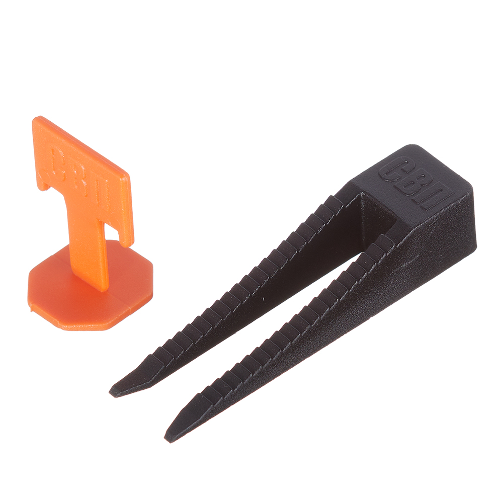 Система выравнивания плитки состоит из двух элементов: клин и зажим. Зажим – размещается снизу под боковыми кромками двух соседних плиток, клин — прижимает две смежные плитки, с целью придания им одного уровня. В данном наборе 40 зажимов и 40 клиньев. Предназначена для быстрой и качественной укладки плитки толщиной от 4 до 14 мм.