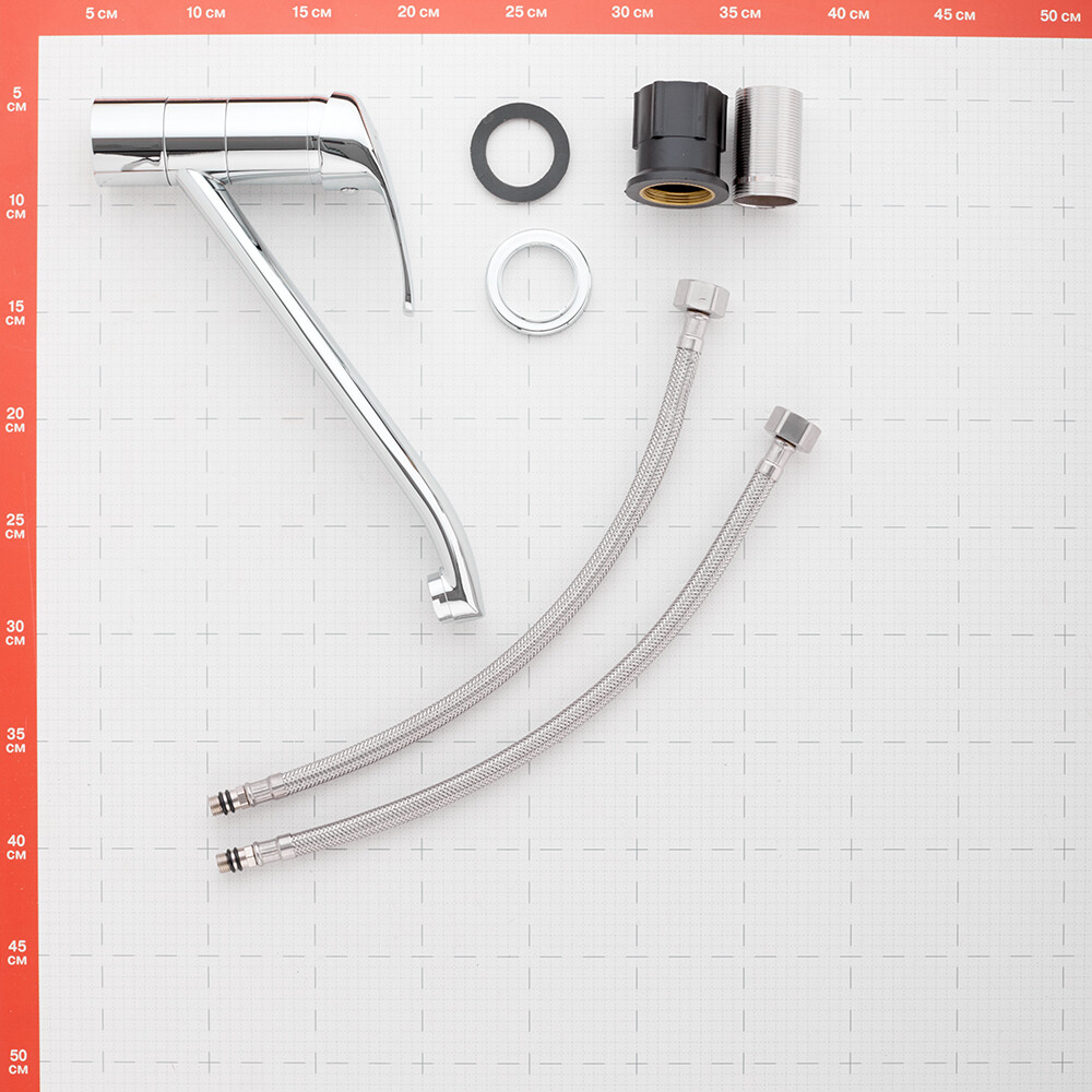 Комплектация: смеситель — 1 шт., гибкая подводка из нетоксичной EPDM резины в оплетке из нержавеющей стали, М10 — 1/2, крепление.