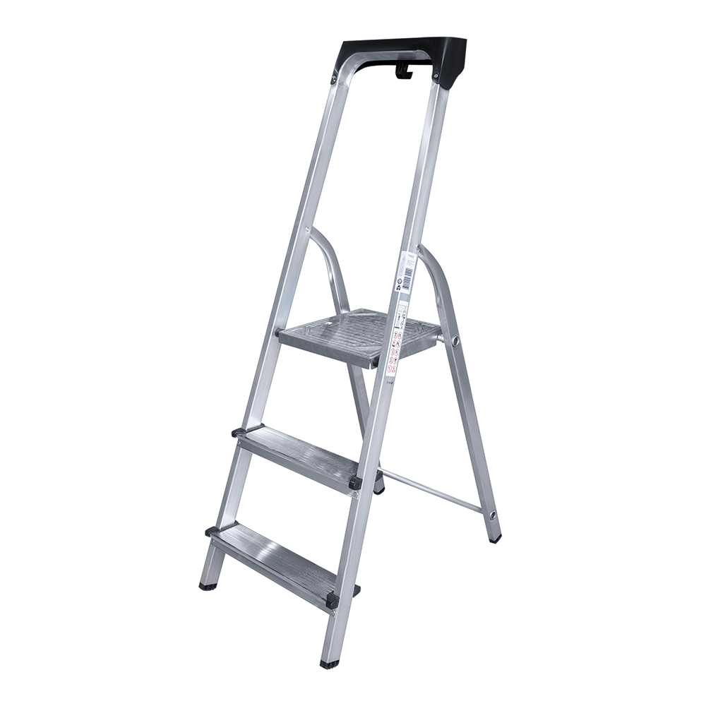 В основании стремянки прочная рама из алюминиевого профиля прямоугольного сечения. Пластиковые наконечники препятствуют скольжению, и обеспечивают отличную устойчивость. Многократное клепаное соединение ступеней с рамой обеспечивает исключительную надежность и безопасность при работе на стремянке.