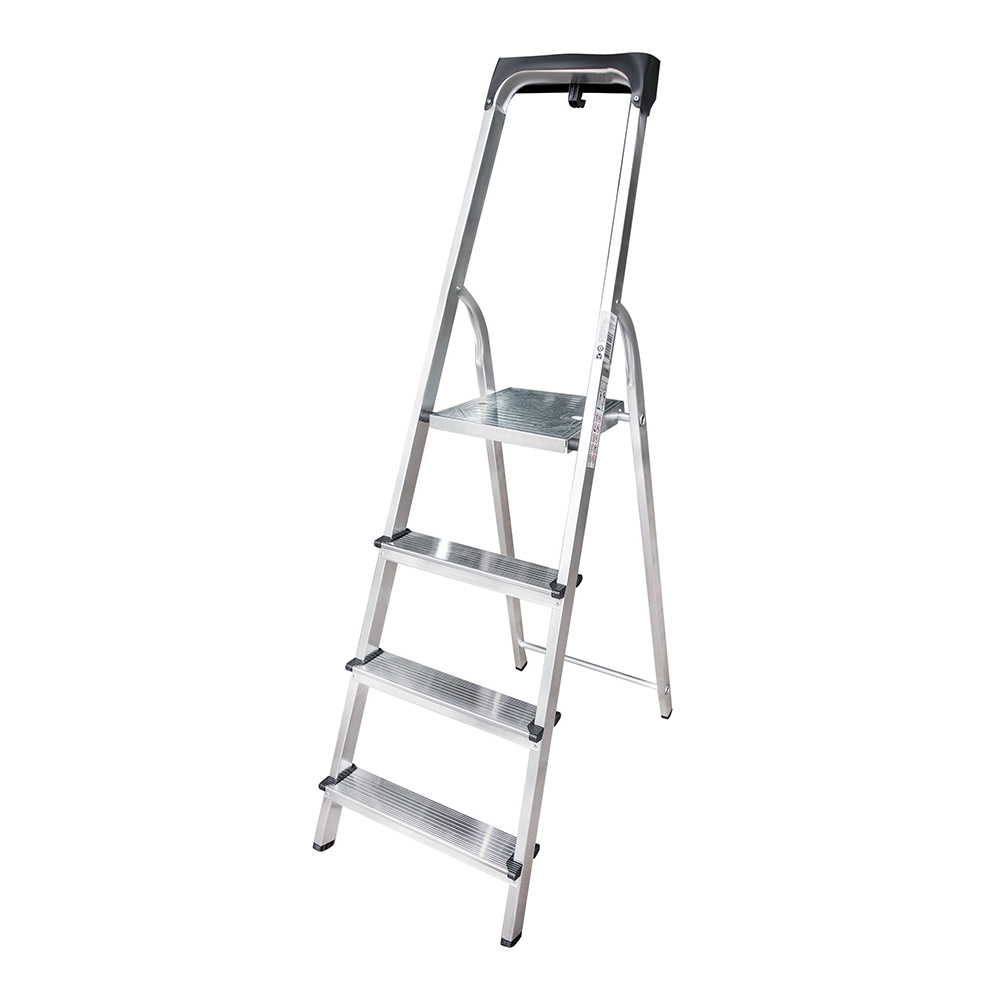 В основании стремянки прочная рама из алюминиевого профиля прямоугольного сечения. Пластиковые наконечники препятствуют скольжению, и обеспечивают отличную устойчивость. Многократное клепаное соединение ступеней с рамой обеспечивает исключительную надежность и безопасность при работе на стремянке.