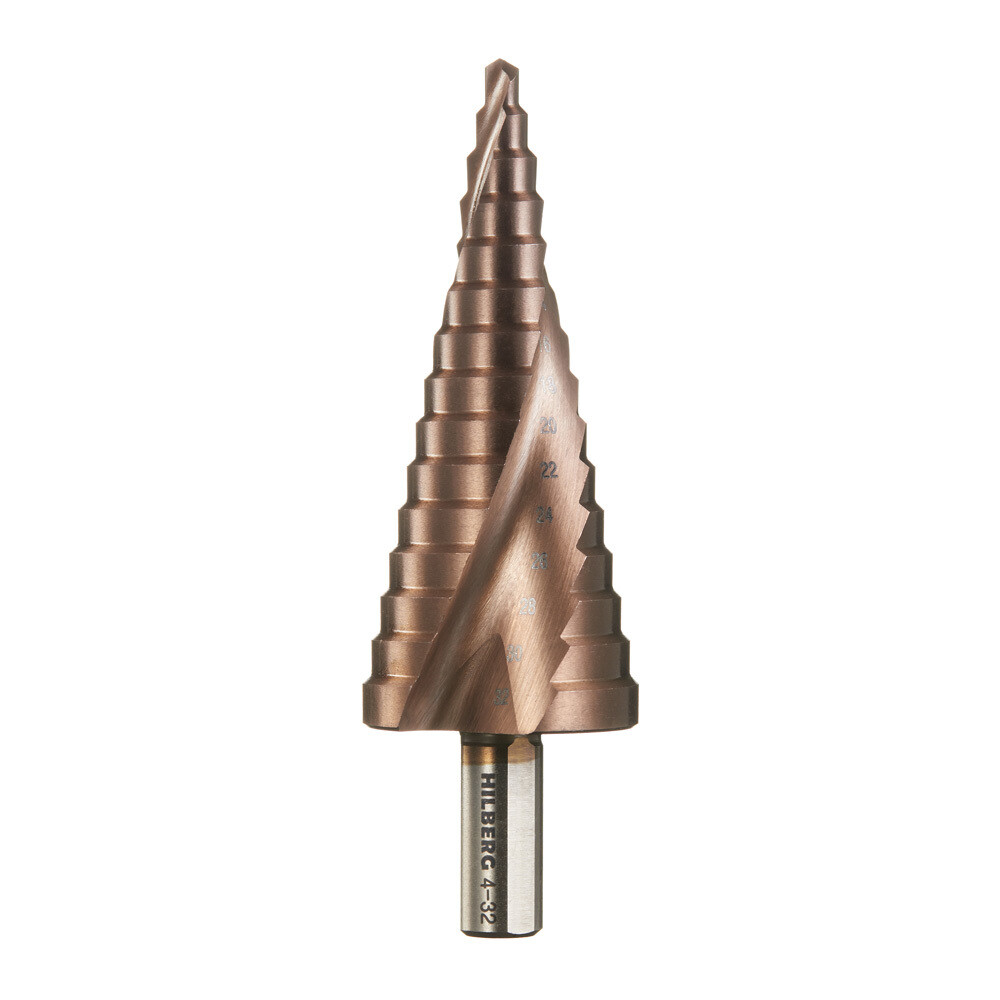 Ступенчатое сверло из быстрорежущей стали HSS (Р6М5) с добавлением кобальта предназначено для высверливания отверстий в листовой стали до 4 мм, а также в цветном металле и пластике. Подходит для использования с дрелью, шуруповертом и сверлильным станком. Диаметры — 4, 6, 8, 10, 12, 14, 16, 18, 20, 22, 24, 26, 28, 30, 32 мм.