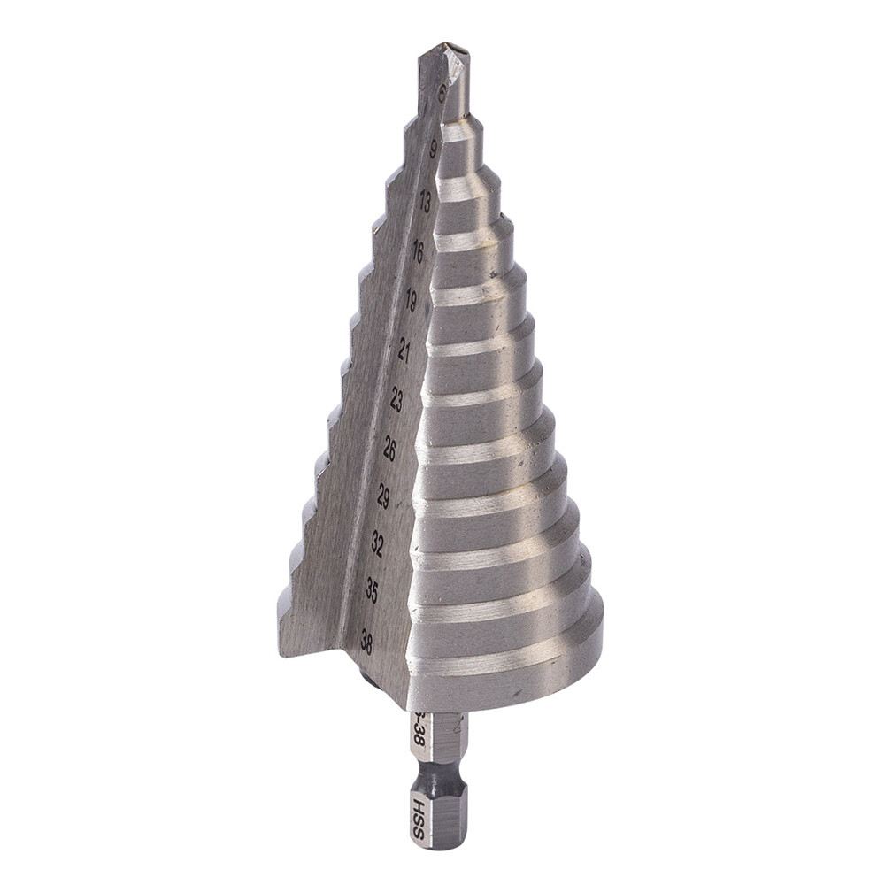 Предназначено для получения отверстий различного диаметра, а также применяется для расширения уже существующих отверстий без перестановки режущего инструмента в изделиях из цветных металлов, тонколистовом металле и твердом пластике. Сверло изготовлено из быстрорежущей стали M2, что позволяет уверенно работать даже с твердым металлом. За счет угла заточки 118° и подточки обеспечивается сверление без смещения с соблюдением нужного размера отверстия. Рабочая часть оснастки сверлит отверстия без деформации, образуя чистую кромку без зазубрин.