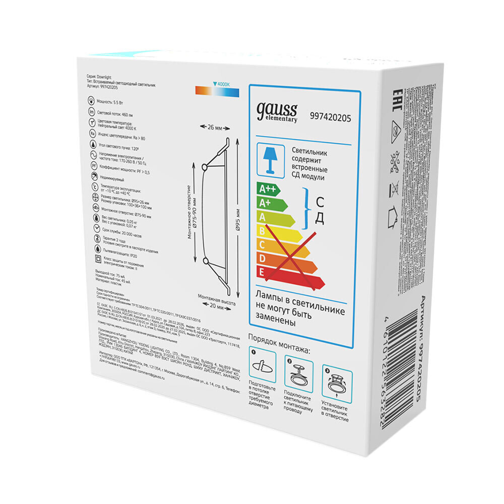 Светильник встраиваемый светодиодный с драйвером белый 5,5 Вт 4000К IP20 Gauss Elementary Downlight (997420205)