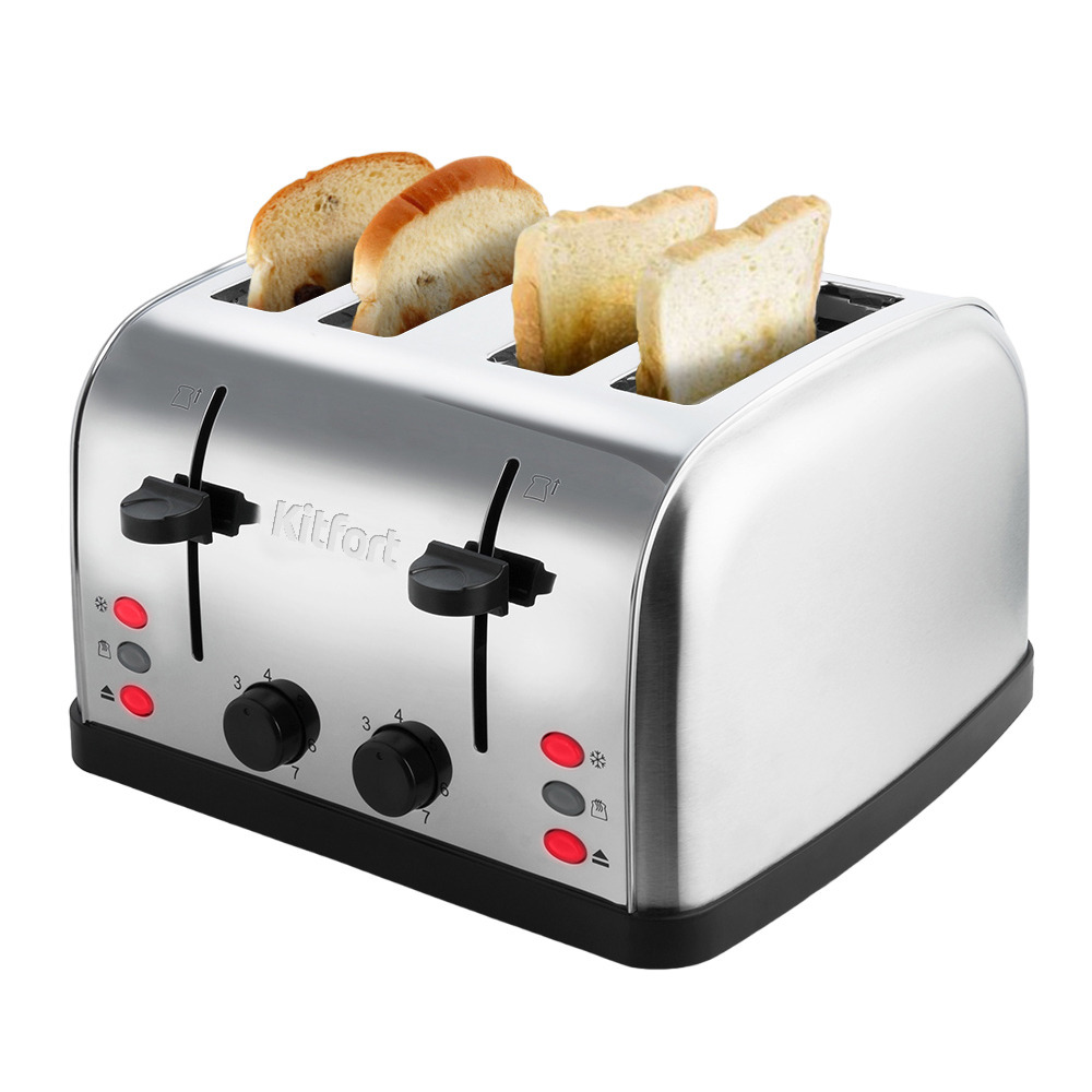 Тостер Kitfort KT-2016 — сдвоенный: он состоит из двух секций с независимым управлением в едином корпусе и позволяет приготовить от одного до четырех тостов одновременно. С помощью поворотного регулятора вы можете настроить степень обжаривания разных сортов хлеба от легкой до сильной обжарки. А также подогреть или разморозить хлеб. Широкие удлиненные слоты с функцией экстра-подъема для удобного извлечения маленьких тостов. Также тостер оснащен съемный поддоном для крошек.