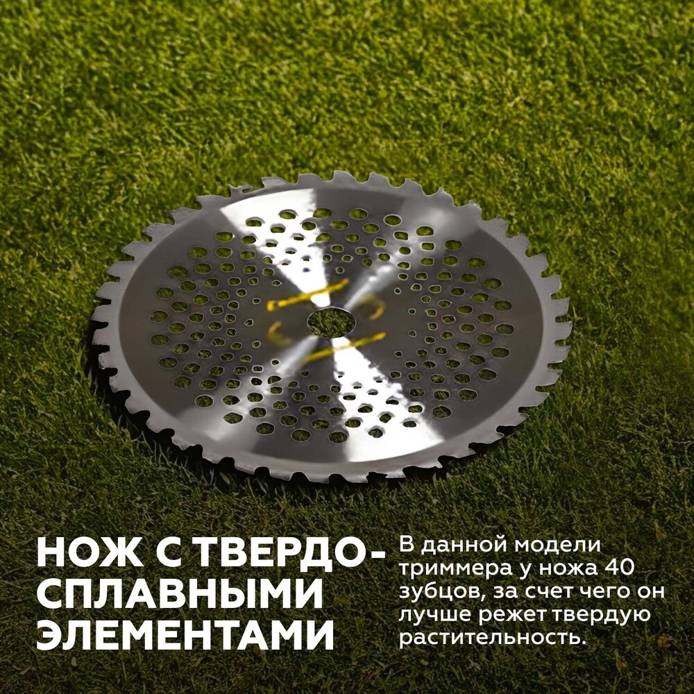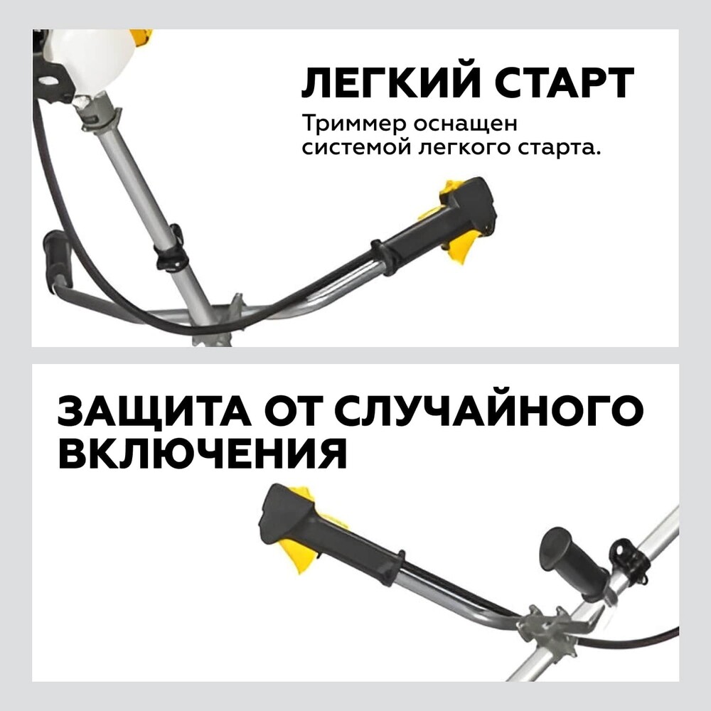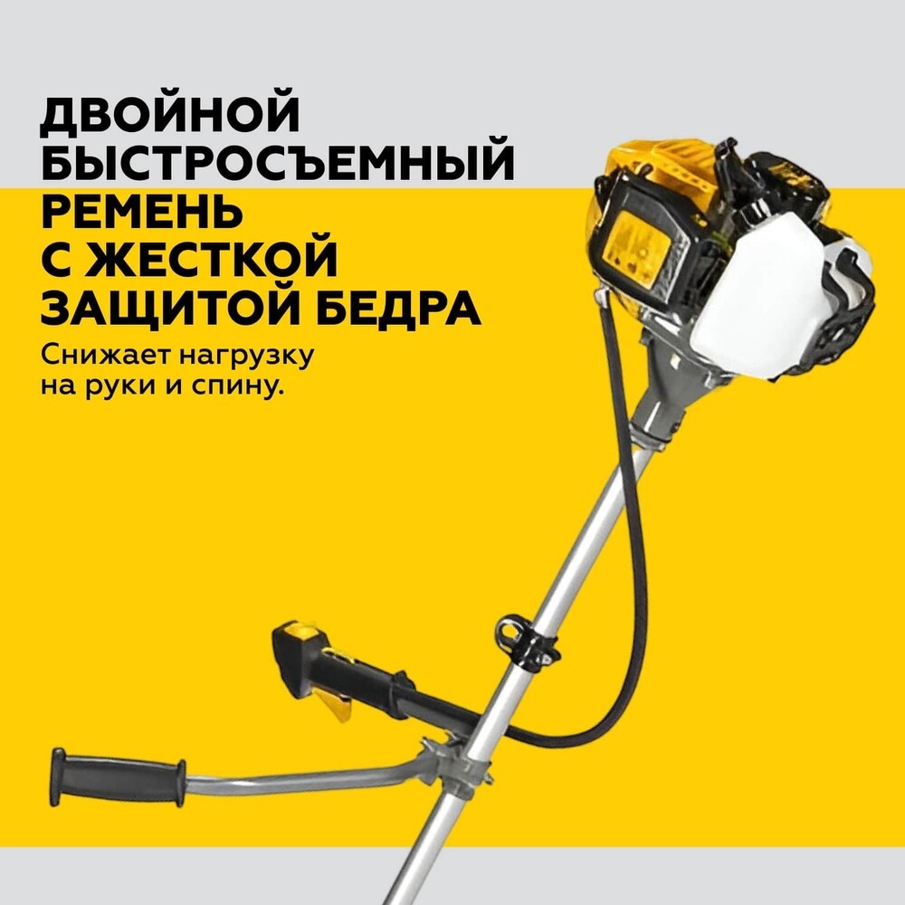 Триммер – 1 шт.; Руководство по эксплуатации – 1 шт.; Емкость для приготовления топливной смеси – 1 шт.; Кожух защитный – 1 шт.; Рукоятка рабочая – 1 шт.; Головка триммерная – 1 шт.; Нож 40 зубцов – 1 шт.; Ключ шестигранный 5 мм – 1 шт.; Ключ шестигранный 4 мм – 1 шт.; Ключ свечной – 1 шт.; Ремень – 1 шт.; Хомут пластиковый – 2 шт.