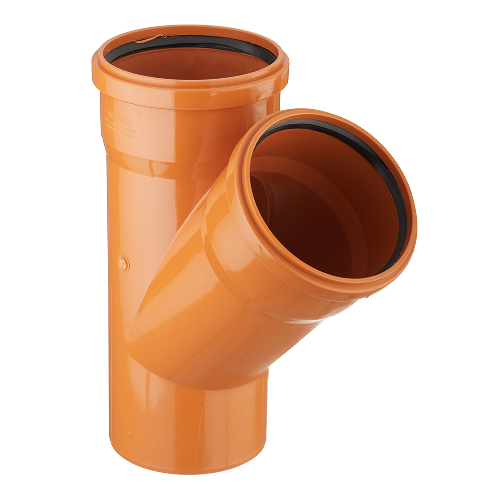 Тройник канализационный предназначен разветвления трубопроводов под углом 45 градусов одного диаметра в системах наружной канализации.