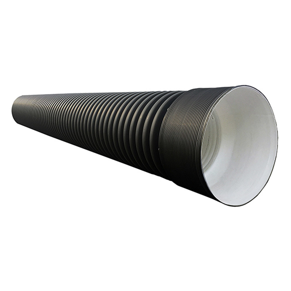 Труба имеет двуслойную структурированную стенку. Наружный слой — гофрированный, черного цвета, внутренний слой — гладкий, белого цвета.