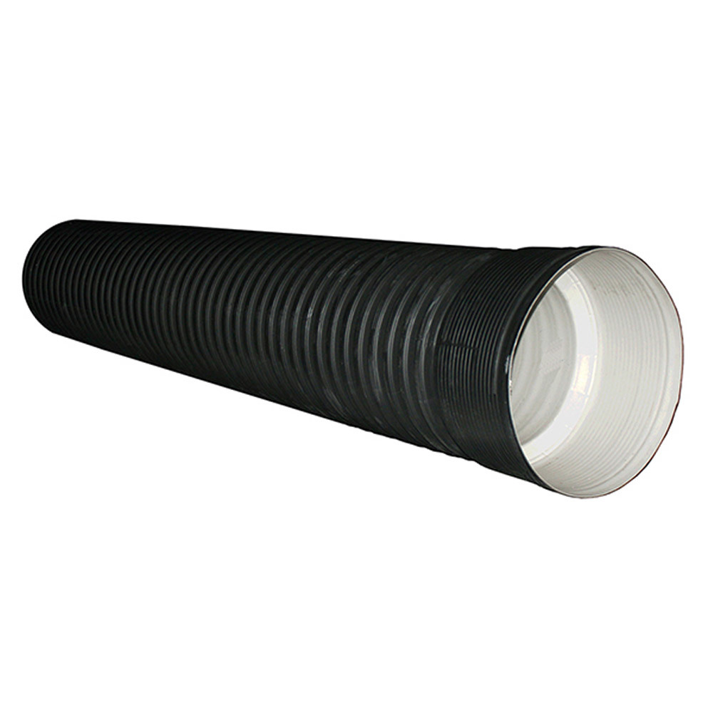 Труба имеет двуслойную структурированную стенку. Наружный слой — гофрированный, черного цвета, внутренний слой — гладкий, белого цвета.