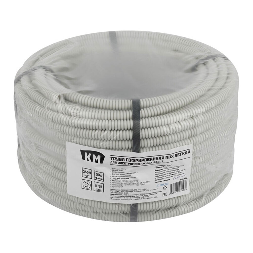 Труба гофрированная ПВХ 16 мм КМ легкая с зондом серая (50 м) (Б0060597)