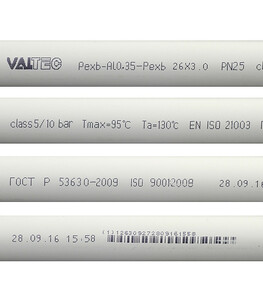 Состав: слой сшитого полиэтилена (PEX b), слой алюминия, слой сшитого полиэтилена (PEX b).