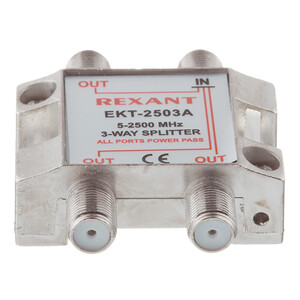 Предназначен для разделения сигнала на несколько равных частей. Антенные делители, также называемые телевизионные сплиттеры часто используются, когда требуется подключить один телевизионный кабель, идущий от антенны, сразу к нескольким телевизорам или ресиверам. Особенно это актуально в многокомнатных квартирах или многокомнатных загородных домах. Делитель имеет один вход под F разъем и три выхода, также под F разъемы. Сигнал, подающийся на вход делителя, делится на две равные части и передается на выходы. Для подключения кабелей используются стандартные F-разъемы. Полоса пропускания делителя от 5 до 2500МГц позволяет использовать его в системах спутникового телевидения. Качественно изготовленный ТВ сплиттер REXANT долго и надежно прослужит в составе телевизионной системы, делая удобной эксплуатацию нескольких телевизоров.