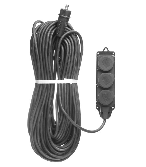Удлинитель-шнур полупрофессиональный с каучуковой колодкой 3 гнезда. Сетевой шнур изготовлен из провода КГ (ТУ) 3х1,5. Удлинитель имеет 3 гнезда розеток со степенью защиты IP-44. Вилка на шнуре разборная, каучуковая со степенью защиты IP-44.