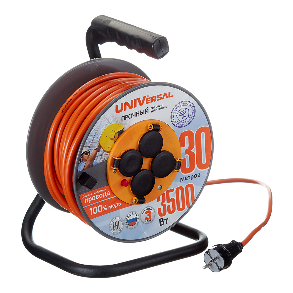 Удлинитель UNIVersal с заземлением 30 м на катушке 3,5 кВт 4 розетки ПВС 3х2,5 кв.мм IP44